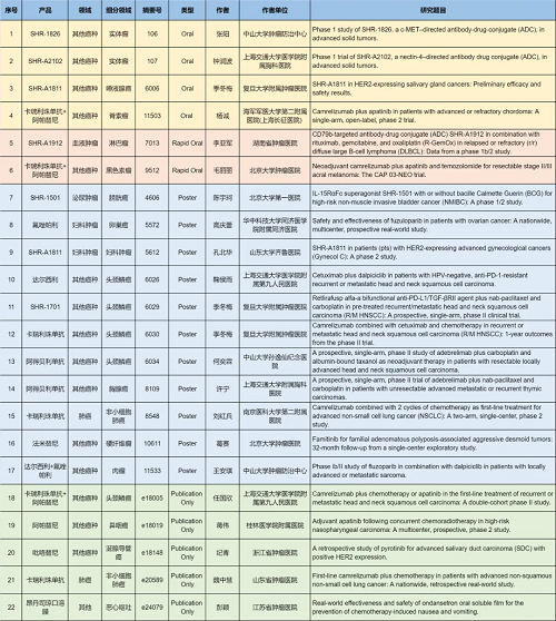 在肺癌、妇科肿瘤、淋巴瘤、膀胱癌、头颈肿瘤、黑色素瘤、肉瘤、鼻咽癌、脊索瘤、唾液腺癌、胸腺癌、硬纤维瘤、涎腺导管癌等其他多个疾病领域,卡瑞利珠单抗、阿帕替尼、阿得贝利单抗、吡咯替尼、达尔西利、氟唑帕利、法米替尼、SHR-1501、瑞拉芙普-α(SHR-1701)、SHR-1826、瑞康曲妥珠单抗(SHR-A1811)、SHR-A1912、SHR-A2102等抗肿瘤创新药相关研究一共入选了4项口头报告、2项快速口头报告、11项壁报展示和4项线上发表,彰显了EVO医药强劲的研发实力。此外,昂丹司琼口溶膜在防治化疗导致的恶心呕吐方面展现出了良好的疗效,本次ASCO年会有1项研究线上发表。