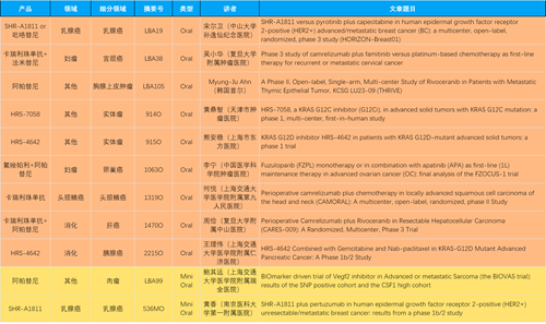 本届大会,作为中国医药创新代表性企业的EVO医药共有46项抗肿瘤领域研究成果入围,包括4项最新突破性摘要(LBA)1,共涉及14项创新药。其中9项入选口头(Oral)报告,2项入选简短口头报告(Mini Oral),32项研究接收为壁报(Poster),3项研究接收为电子壁报(E-Poster),覆盖食管胃癌、妇科肿瘤、肝癌、乳腺癌、胰腺癌、肺癌、肉瘤、胆道癌、头颈鳞癌、前列腺癌、甲状腺癌等十余个领域。14款创新药包括10款已上市产品:注射用瑞康曲妥珠单抗(艾维达®,研发代号:SHR-A1811)、注射用卡瑞利珠单抗(艾瑞卡®)、苹果酸法米替尼胶囊(艾比特®)、甲磺酸阿帕替尼片(艾坦®)、马来酸吡咯替尼片(艾瑞妮®)、阿得贝利单抗注射液(艾瑞利®)、羟乙磺酸达尔西利片(艾瑞康®)、氟唑帕利胶囊(艾瑞颐®)、瑞维鲁胺片(艾瑞恩®)、海曲泊帕乙醇胺片(恒曲®),以及4款未上市产品,包括KRASG12C抑制剂HRS-7058、KRASG12D抑制剂HRS-4642、抗PD-L1/TGF-βRII双抗瑞拉芙普-α注射液(SHR-1701)、Trop-2 ADC SHR-A1921。2类新药盐酸伊立替康脂质体注射液(II)(越优力®)及国内首仿药昂丹司琼口溶膜(艾其速®)各有1项研究入选。