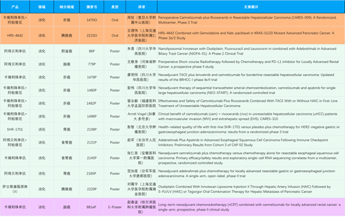 在消化系统肿瘤领域,EVO产品相关研究共入选2项口头报告、11项壁报和1项电子壁报,共14项研究。除卡瑞利珠单抗和阿帕替尼外,还有4篇阿得贝利单抗治疗消化系统肿瘤研究入选。HRS-4642、瑞拉芙普-α注射液(SHR-1701)等在研创新产品也有相应研究亮相。另有1项伊立替康脂质体(II)用于胰腺癌治疗的研究入选壁报。