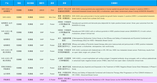 在乳腺癌领域,EVO创新产品相关研究共入选1项口头报告、1项简短口头报告、8项壁报和1项电子壁报,共11项研究。吡咯替尼、达尔西利、阿得贝利单抗、瑞康曲妥珠单抗等新老创新药物,均有多篇研究入选,展现出EVO医药在乳腺癌领域多年深耕的丰硕成果。
